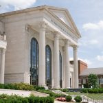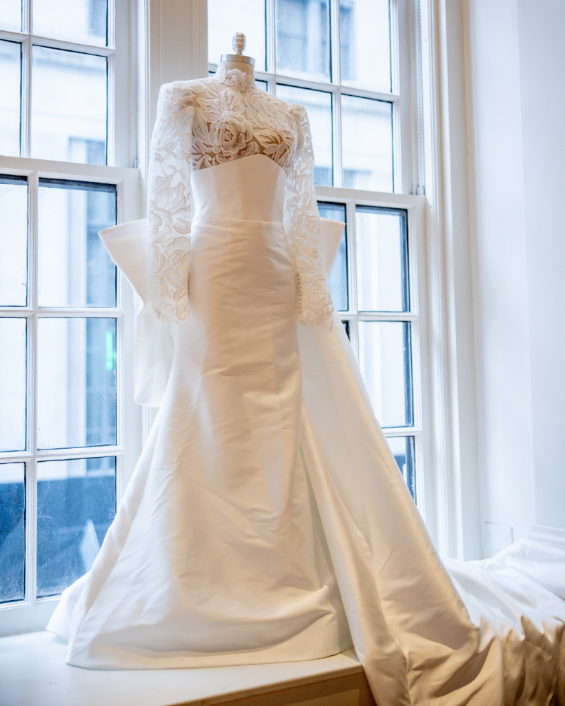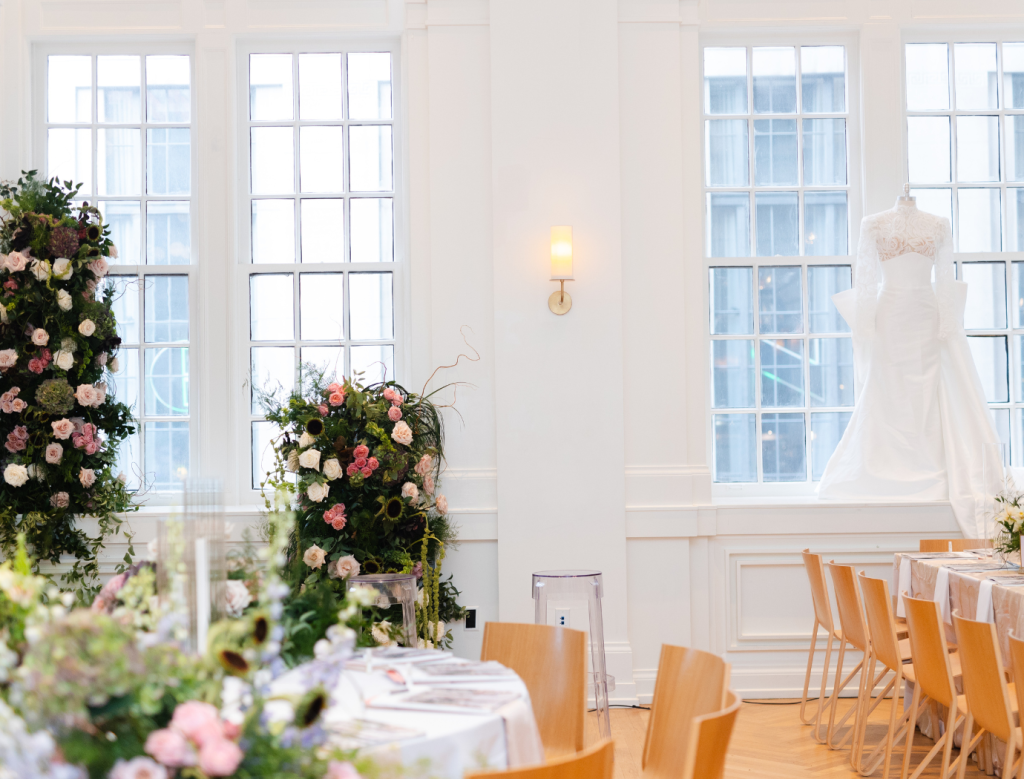 Adding to the beauty, Adorn Bridal showcased stunning dress displays that brought a fashion-forward element to the space. The design came together seamlessly with glowing tabletop lamps from Mack Hatcher Events and modern acrylic ghost bar stools from Quest Events that elevated the panel setup. Completing the scene, custom fabric signage by Bivins Banner Co. added a personalized touch.