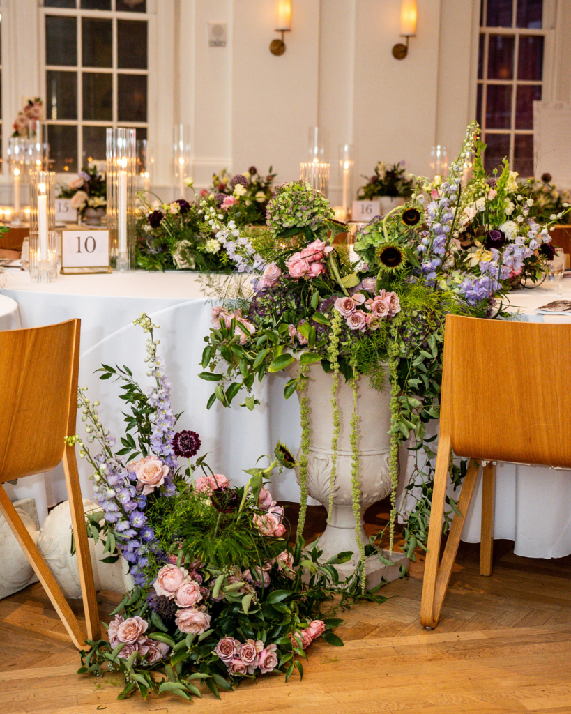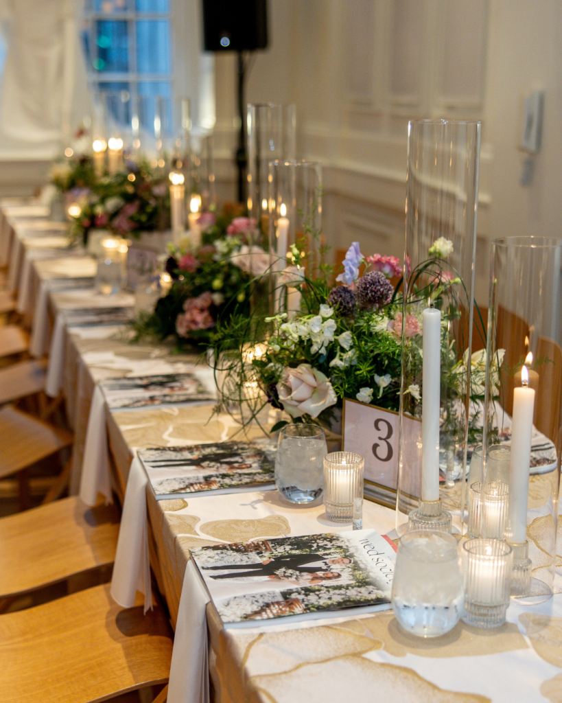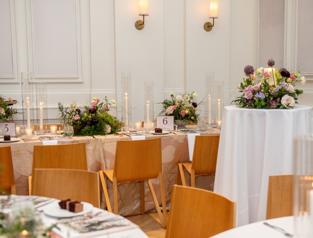The talented team at Siena & Co. Events took the lead in bringing the evening’s vision to life. Their thoughtful approach ensured that every moment, from the first guest arrival to the final toast, unfolded effortlessly. The space came alive with lush floral arrangements by LMA Designs, who artfully blended delicate lavender and soft pink blooms to create the most romantic scene. Beautiful linens from Luxe Linens elevated the tablescapes and complemented the soft color palette beautifully.