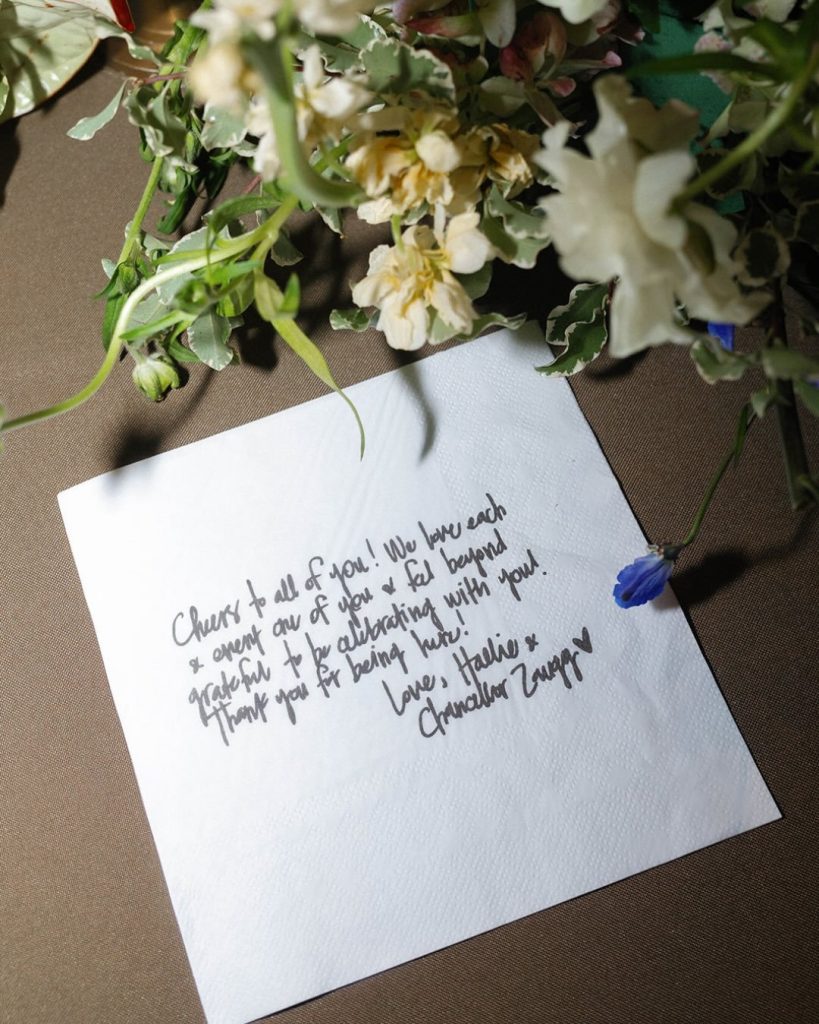 One of the sweetest personal touches of the day was the custom cocktail napkins, each featuring a handwritten note to the guests from Hallie & Chancellor. It was a small detail that made the experience even more personal. With its stunning venue, colorful florals, and thoughtful personal touches, this wedding was truly a celebration to remember.