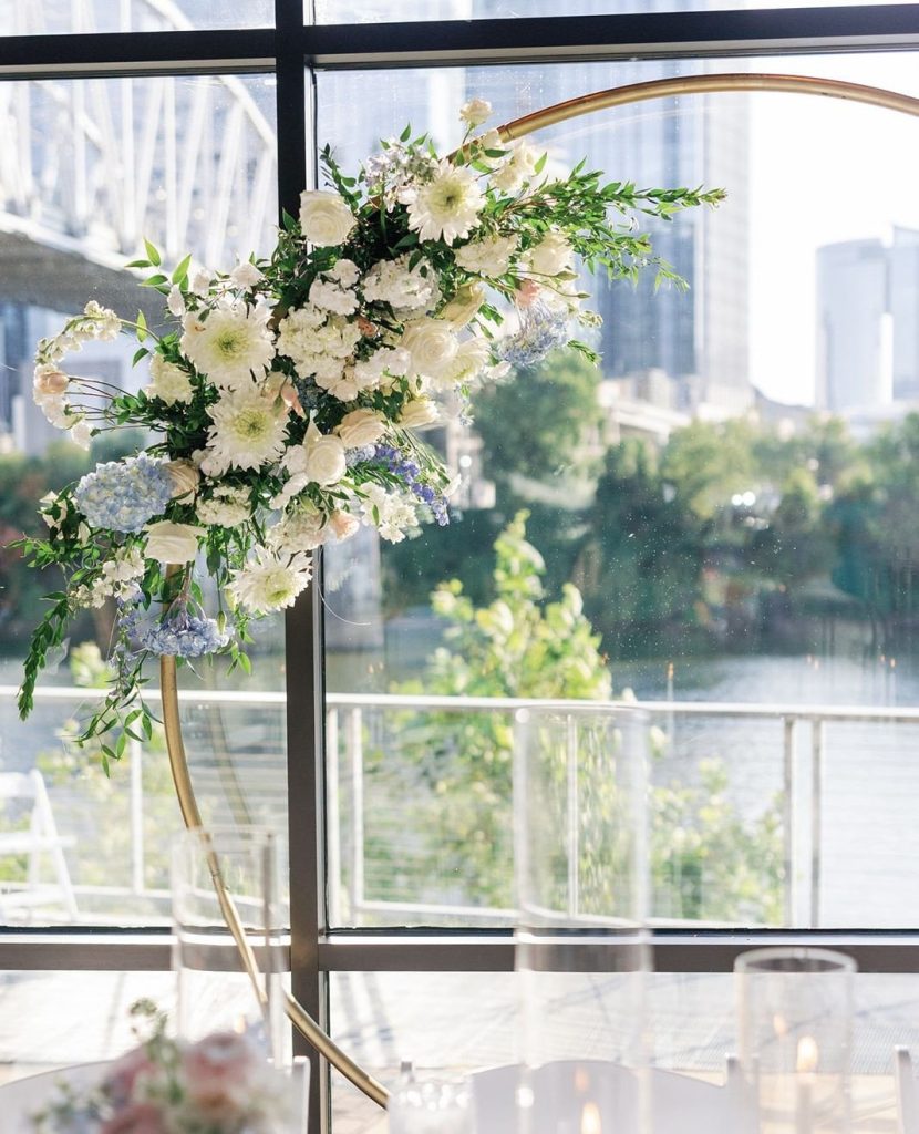 The bridal party made a statement in all-white bridesmaid dresses, an out-of-the-box decision that perfectly fit the day. Against the clean palette, soft hints of blue were sprinkled throughout the design, adding just the right touch of color. Larson Floral’s gorgeous floral creations elevated the look even further, bringing in delicate blooms that perfectly complemented the neutral tones.
