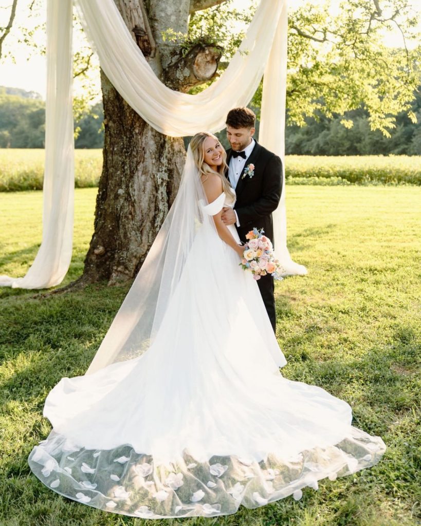 Couple shares intimate moment beneath flowing veil in outdoor garden setting